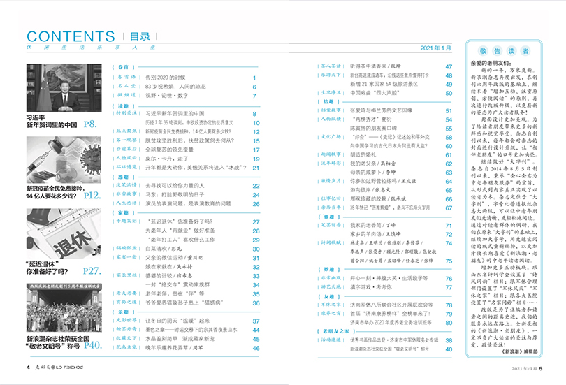 在杂志中,读者可以找到丰富的内容,涵盖了老年人生活的各个方面。该杂志会为读者提供养生保健、健康饮食、适老运动、兴趣爱好、长寿秘诀等方面的资讯和建议。通过介绍和推广养生保健的方法和理念,帮助读者延年益寿、保持健康、提高生活质量。